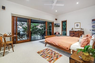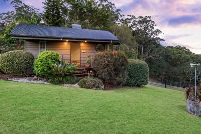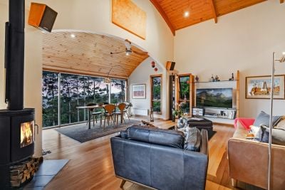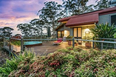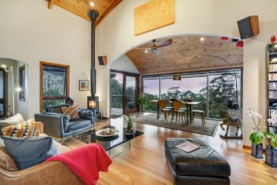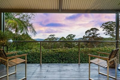 Positioned 450 metres above sea level, the property captures cooler mountain air and uninterrupted views of the ocean, valley, and lush bushland.