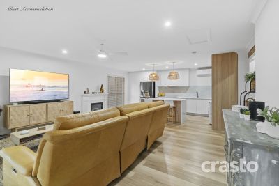 Step inside and the home features spacious and stylish living zones with a warm, contemporary feel. The main residence offers four bedrooms with optional study, master bedroom complete with stylish modern ensuite and walk in robe. Two bedrooms with WIR and forth/study with large built-in robe. Living areas boast good seperate living space with air conditioning and showcase warm hybird flooring with a cozy fireplace, creating a welcoming ambience. The kitchen has been tastefully updated with quality finishes, including stone benchtops, ample bench space and storage, modern appliances, soft-close drawers, and a generous size pantry with draw storage for convenience and to cater for the growing family.