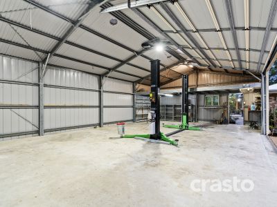 Additional highlights include electric gated entrance, large 12 x 7.5 metre shed with mezzanine storage and a built-in hoist – ideal for trades, car enthusiasts, additional 4 x 6 metre storage shed, as well as sustainable features including a huge solar power system with battery, double insulation, 10,000L water tank, town water, security cameras, and air conditioning throughout and fully fenced.