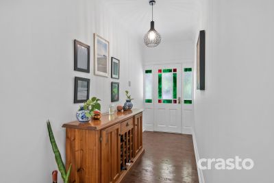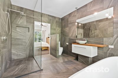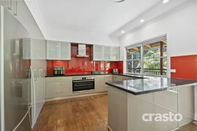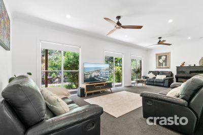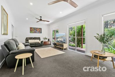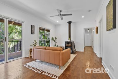 warmth and charm throughout. Wide verandas wrap around the exterior, inviting you to relax and enjoy the serenity of the surrounding landscape from every angle. Inside, the thoughtful floorplan offers four generous bedrooms, including a spacious master retreat complete with walk-in robe and ensuite. The home provides ample space with separate living areas including a formal lounge, family, and meals area, all enhanced by rich laminate timber floors, impressive high ceilings, and large windows and doors that frame peaceful views of the lush gardens and natural bushland beyond.